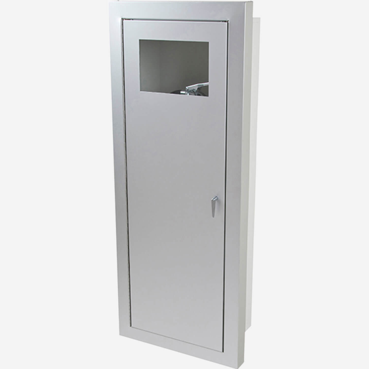 These tall semi-recessed fire-rated Alta Valve Cabinets are designed to hold a 2-1/2" Angle Valve and fire extinguisher up to 20 lbs. The box is constructed from galvannealed Steel with an electrostatically applied thermally-fused polyester coating with recoatable white finish and continuous hinge. A shelf separates the extinguisher and valve sections. The door and frame are constructed from materials as follows: Model 8027: galvannealed steel with recoatable white polyester finish; Model 8047: Aluminum with clear anodized finish; Model 8067: #304 Stainless steel with #4 finish.