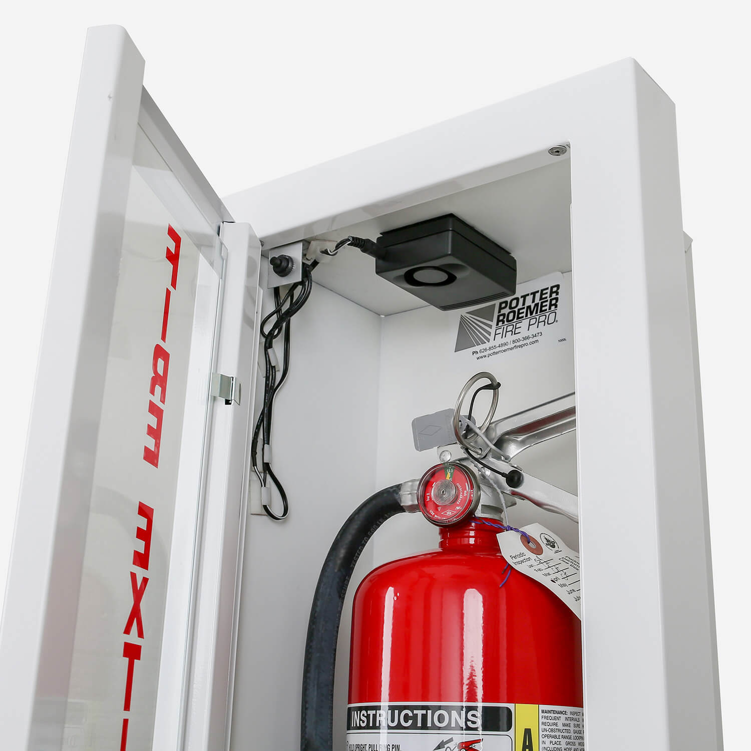 This battery-operated cabinet alarm sounds when the fire extinguisher cabinet is opened.
