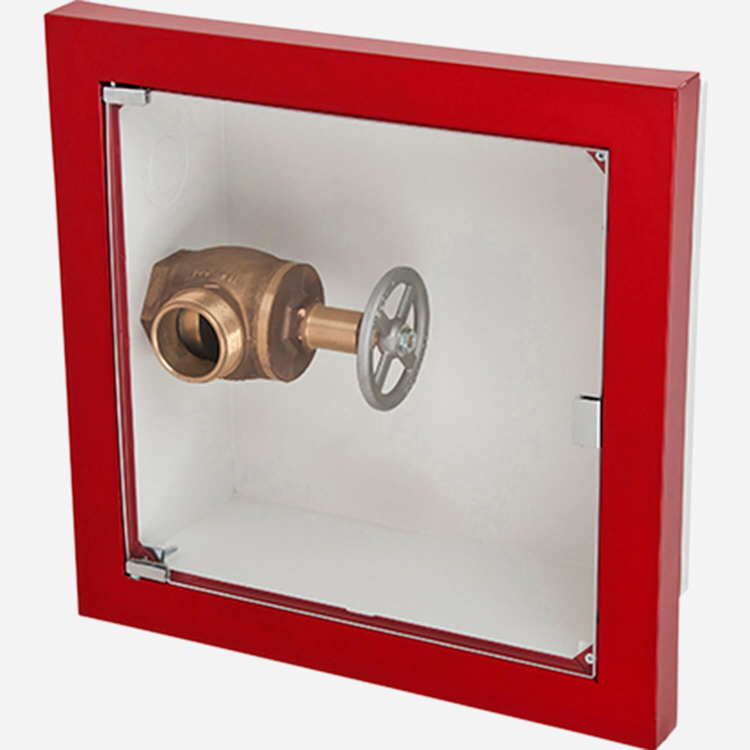 These are Potter Roemer Buena Style Fire Dept. Valve Cabinets configured for Semi-Recessed mount with 2 inches (50.8 mm) thick trim protruding from the wall. The cabinet is designed to accommodate a 2-1/2 inch angled Fire Dept. Valve (not supplied).