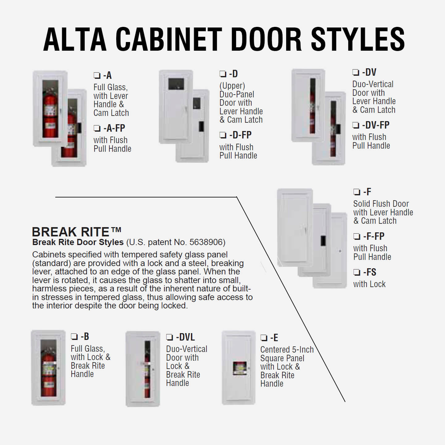 | Door Style | -A-FP | Full Glass w/ Tempered Safety Glass & Flush Pull Handle, -B | Break-Glass w/lock & Break Rite® Handle, -D | Duo-Panel w/ Tempered Safety Glass, -D-FP |Duo-Panel w/Tempered Safety Glass & Flush Pull Handle, -DV | Duo-Vertical Panel w/ Tempered Safety Glass, -DV-FP | Duo-Vertical Panel w/ Tempered Safety Glass & Flush Pull Handle, -DVL | Duo-Vertical Panel with Lock, TSG & Break Rite® Handle, -E | Tempered Safety Glass (25 sq. in.) w/ Break Rite® Handle, -F | Flush Solid Metal, -F-FP | Flush Solid Metal & Flush Pull Handle, -FS | Flush Solid Metal w/ Lock, -A | Full Glass w/ Tempered Safety Glass |
