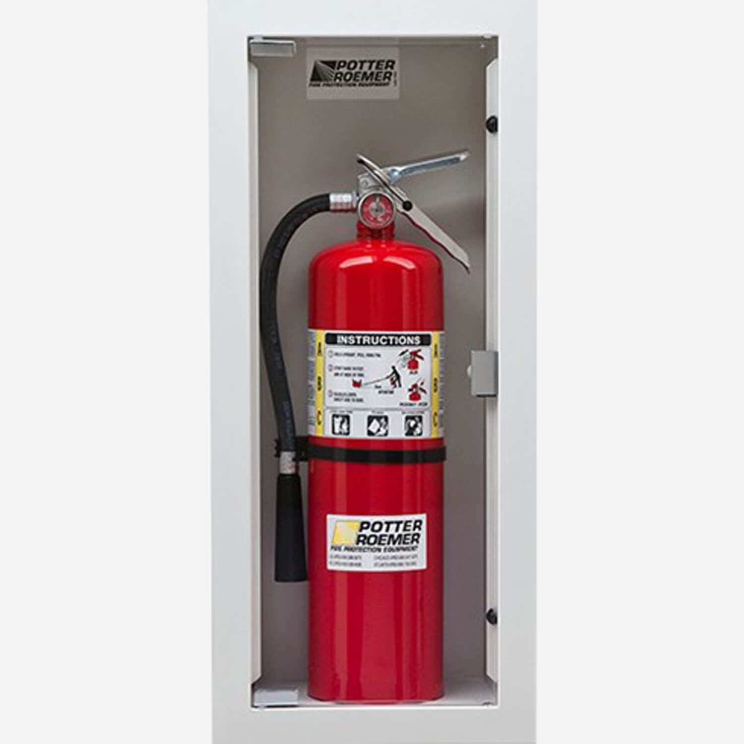 Buena fire-rated fire extinguisher cabinets are configured for semi-recessed mount with 3" trim. The top and front edge of the trim has a rolled radius. They are covered by an external steel fire protection box with a layer of fire-rated insulation material. Fire Rating: 2 Hours.