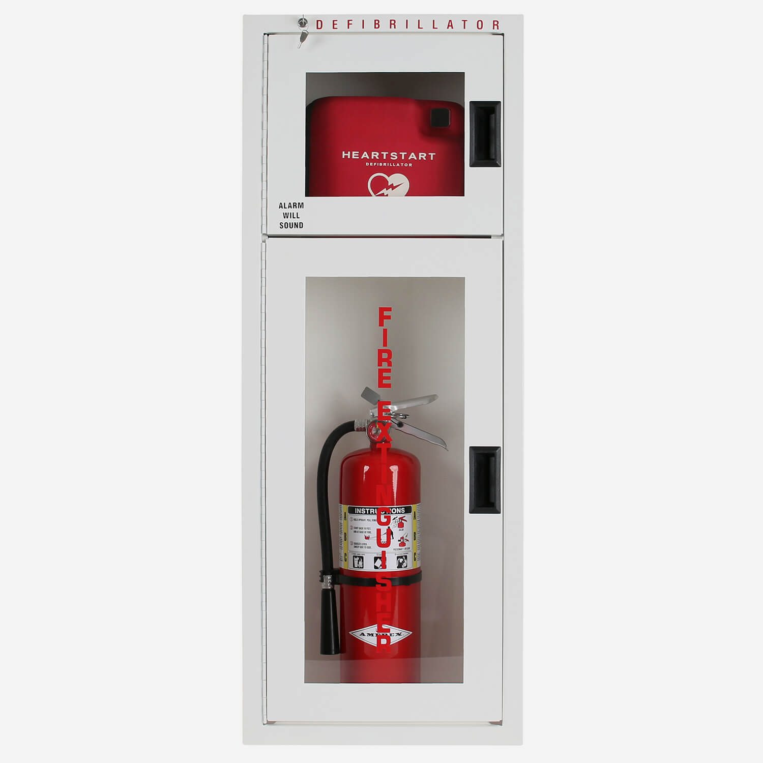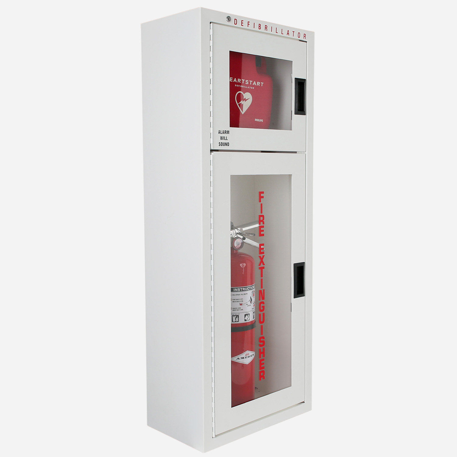 Black die cut lettering ALARM WILL SOUND and red die cut lettering DEFIBRILLATOR on top section; Red die cut lettering FIRE EXTINGUISER