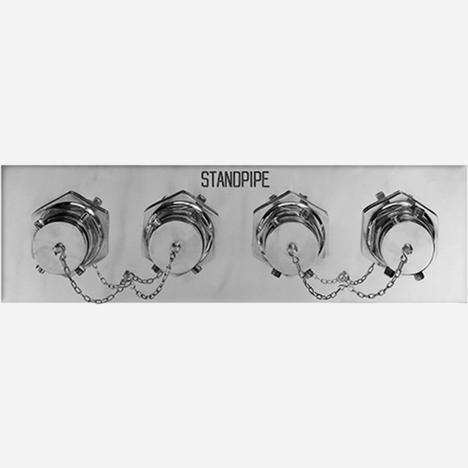 This four-way flush clapper snoot type inlet for fire department connections has a brass or ductile iron body and polished brass plate with lettering as selected. It has a U/L listed polished brass double female clapper snoots with rigid end 3” (76.2 cm) NPT x 2.5” (6.4 cm) pin lug hose thread swivels pin lug plugs and chains. The connection can be horizontal or vertical with a 6” back end or angle outlet.