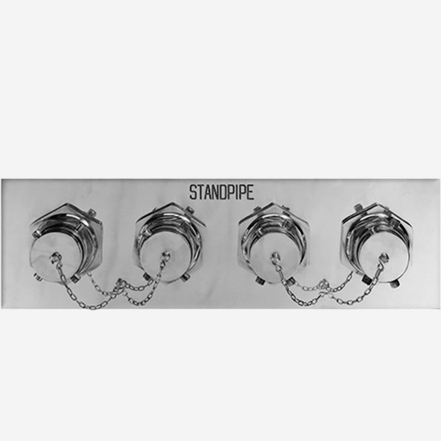 This four-way flush clapper snoot type fire department connection is intended for use as an auxiliary inlet connection to supplement the fire department’s water supply. It has a steel body with a thermally-fused red polyester coating. It has a 6” end back or angle outlet. The polished brass plate has lettering as selected. Includes U/L listed polished brass double female clapper snoots with rigid end 3” (76.2 cm) NPT x 2.5” (6.4 cm) pin lug hose thread swivels pin lug plugs and chains.