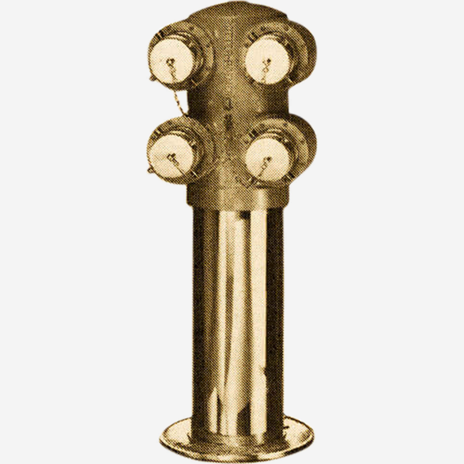 This four-way freestanding fire department connection features four inlets in a 2 x 2 format with a single outlet directed into the grade. This connection is for use in supplementing the facility’s fire department water supply. It has an 18" long polished brass cover sleeve, cast brass identification baseplate, cast brass plugs, and chains on each pin log and swivel.