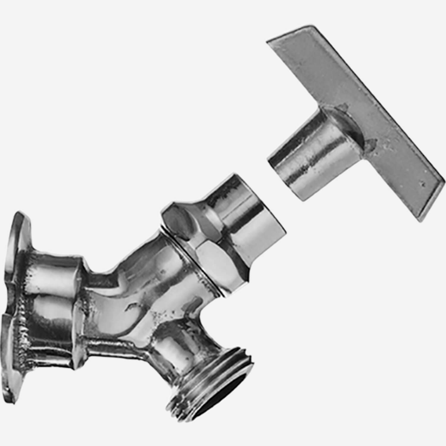 This sillcock is used to manually drain the low point of the system between the fire department connection and swing check valves. The sillcock is constructed from polished brass with ¾” female NPT inlet male GHT stem shield and removable tee handle key.