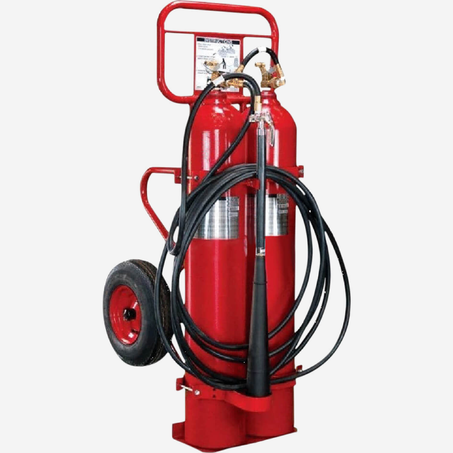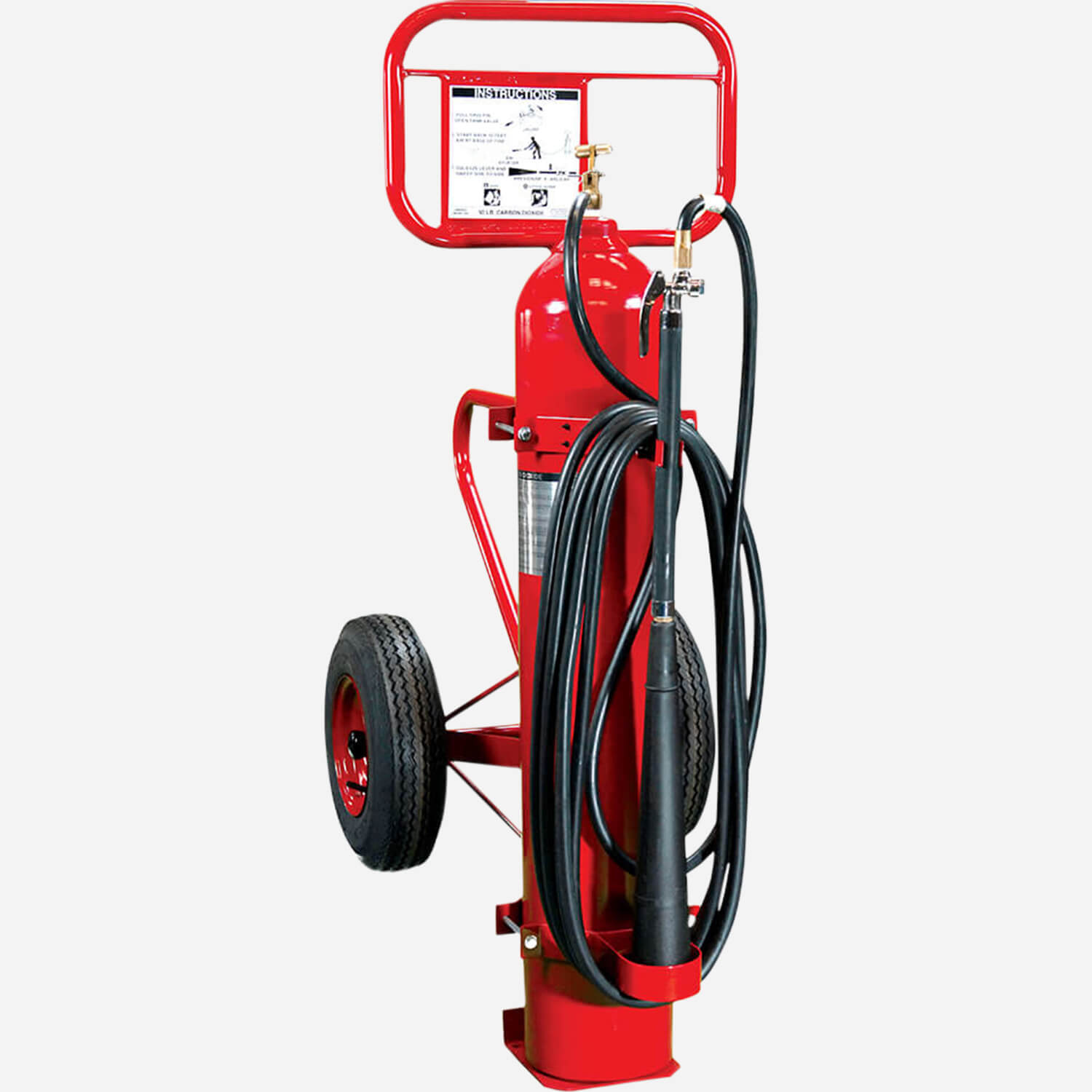 Red glossy polyester coated steel cylinder black carriage. Quick release non-kink hose with shock resistant rubber insulated horn and handle. Diffusion tip and safety release disc in discharge valve. Pressurized content is a non-contaminating non-conductive odorless gas. Semi-pneumatic tires. Model 3610 provide 50 lbs. (22.7 kg) capacity while Model 3620 featuring dual tanks provide total capacity of 100 lbs, (45.4 kg).