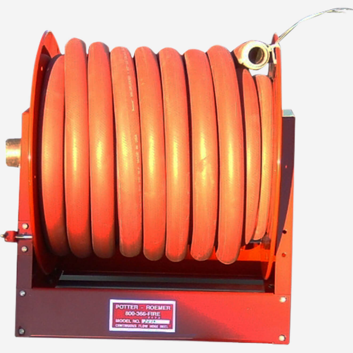 This continuous flow hose reel is a red glossy polyester coated steel drum with rims and universal mounting stand. This reel has a Female N.P.T. inlet with male N.S.T. hose outlet. The inlet size and hose capacity is selected by model number.