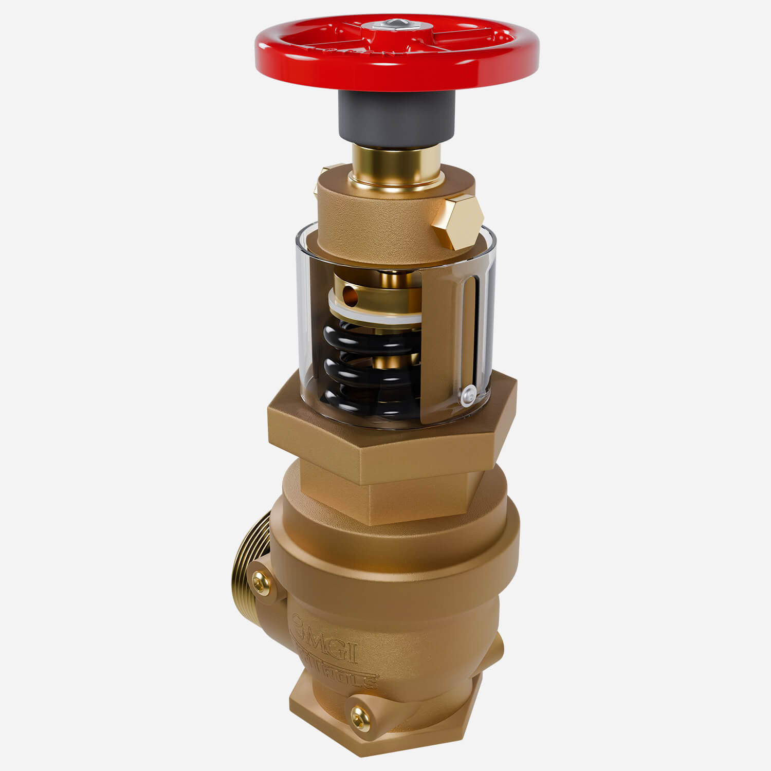 MODEL 4023-FA2 Cast bronze angle valve with inside screw rising stem, internal parts of brass, and chrome silicon. Red aluminum hand wheel. Inlet is 2-1/2" NPT female; Outlet is 2-1/2" male hose thread.