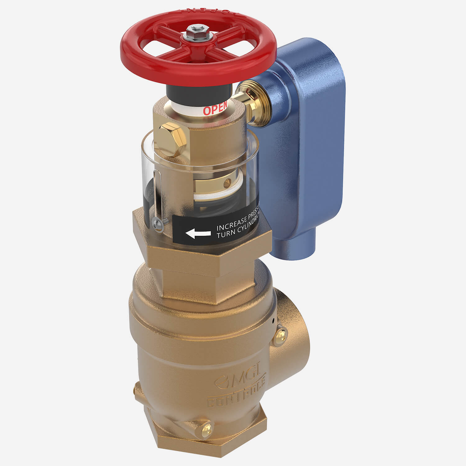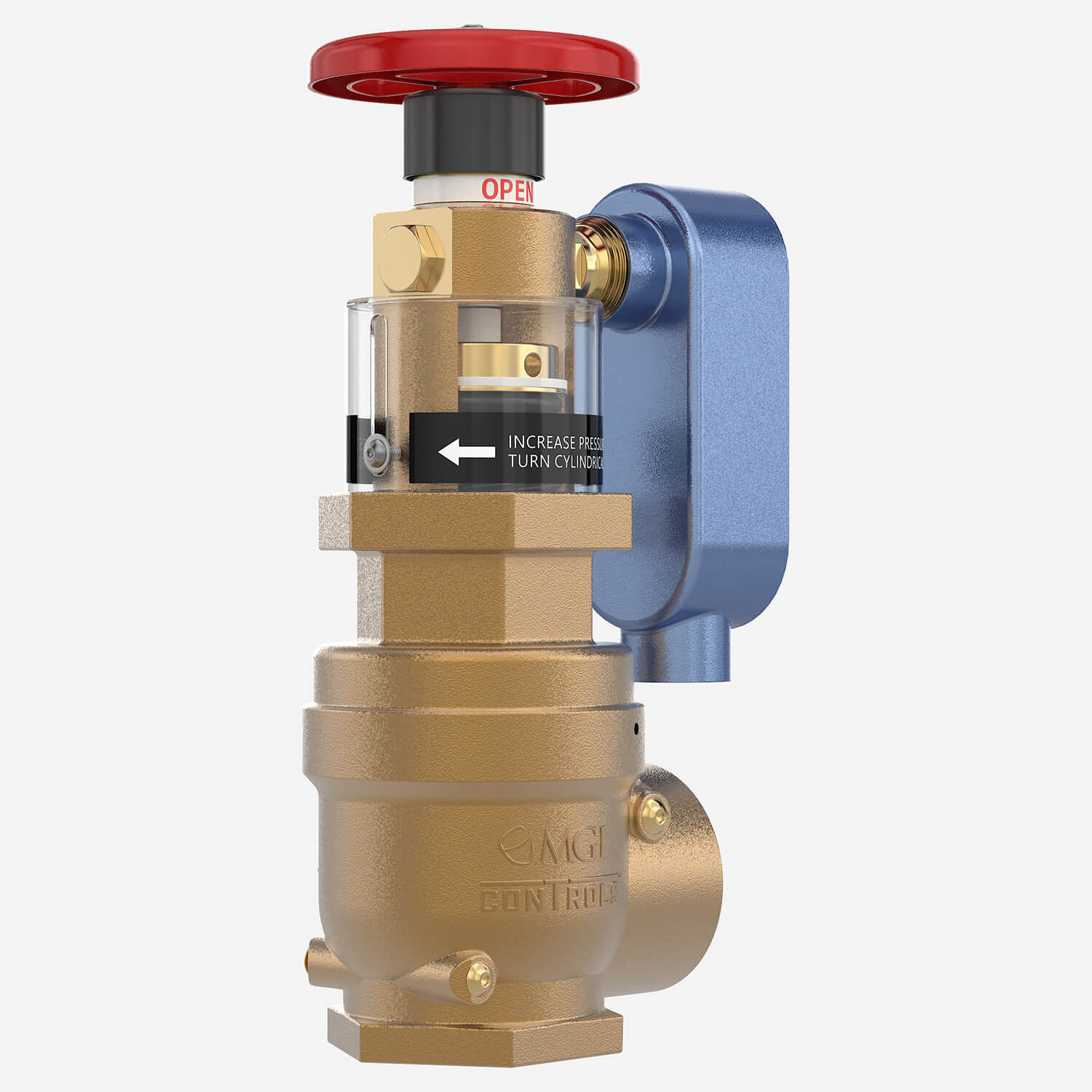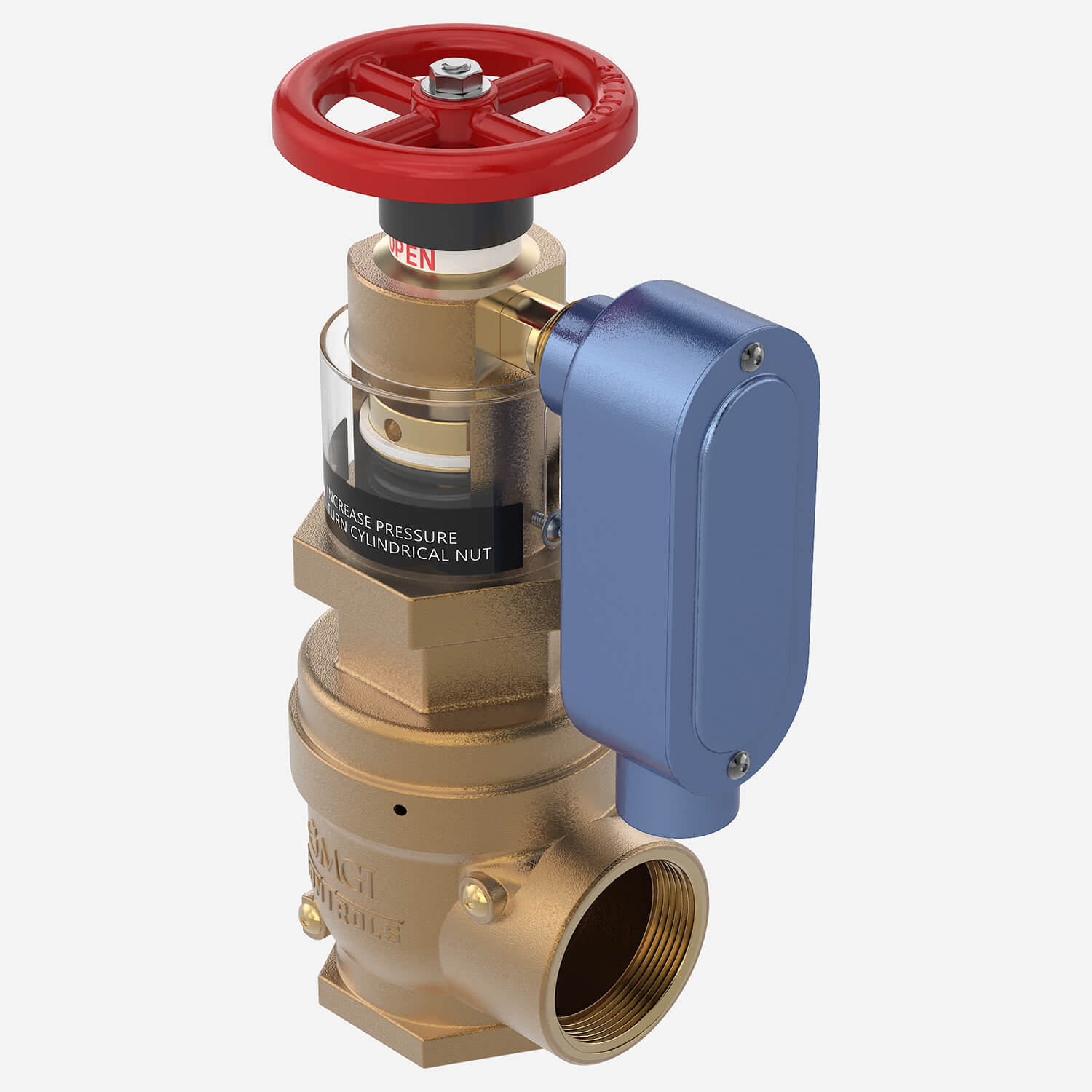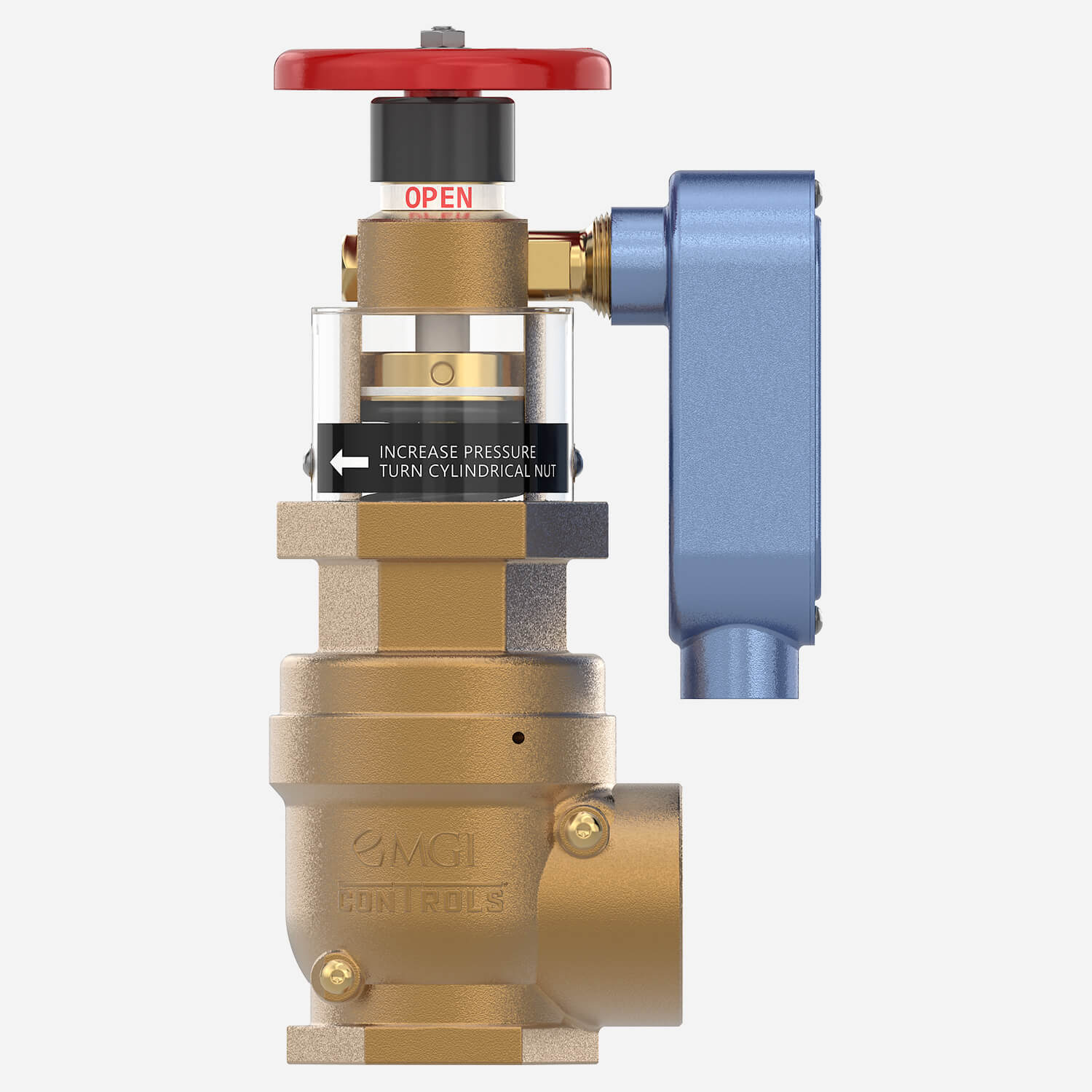 MODEL 4032-FA2 Cast bronze valve with rising stem, brass, and chrome silicon internal parts. Red aluminum hand wheel. Regulates pressure under both flow and no-flow conditions. Female 2-1/2" N.P.T. inlet and outlet.