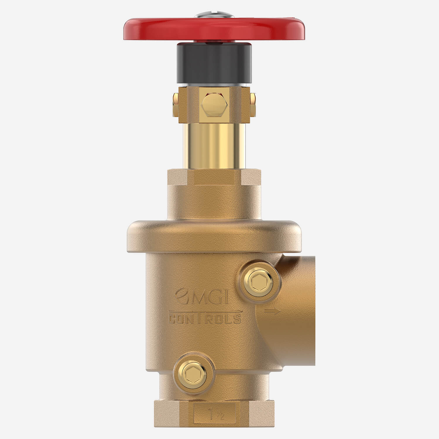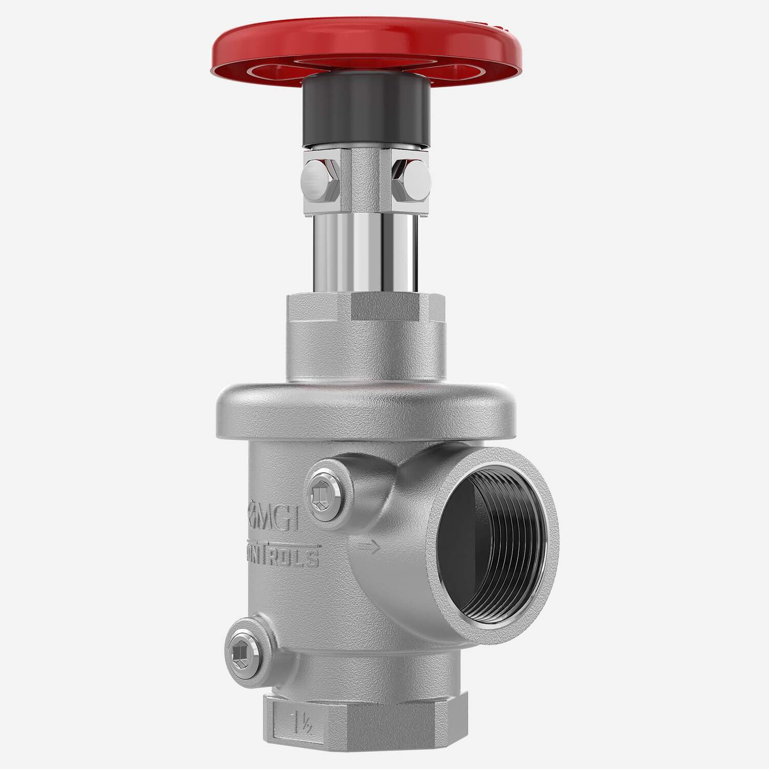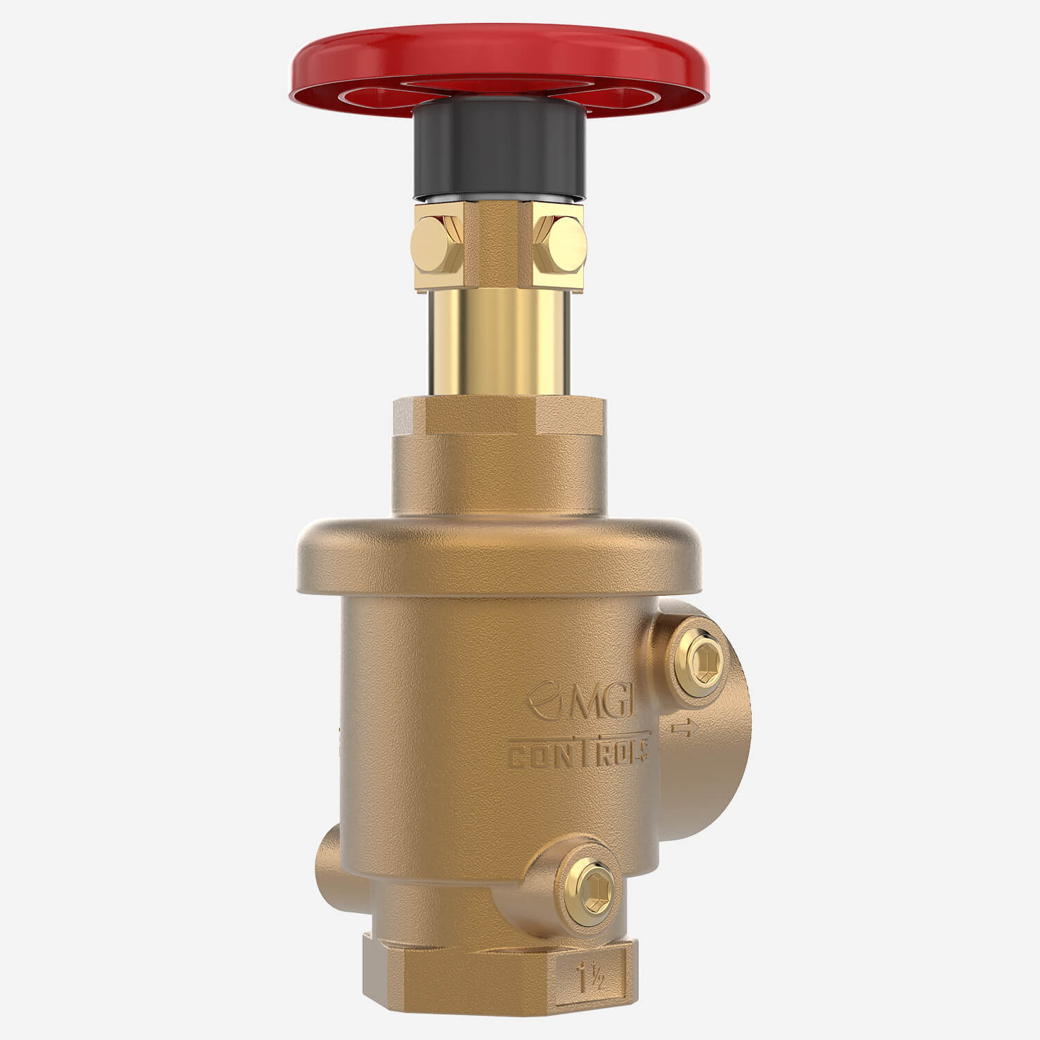 MODEL 4042-FS2 Cast bronze valve with rising stem, internal parts of brass, and chrome silicon. Red aluminum handwheel. Regulates pressure under both flow and no-flow conditions. Female 1-1/2" N.P.T. inlet and outlet.