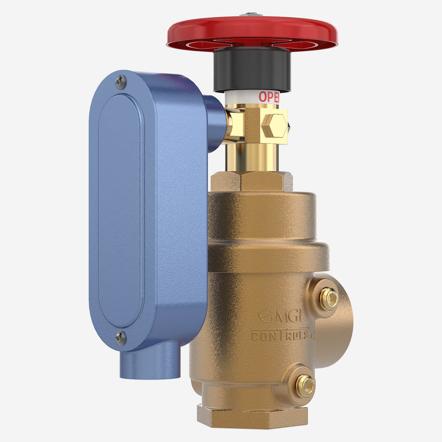 MODEL 4043-FS2-GV Cast bronze valve with rising stem, internal parts of brass, and chrome silicon. Red aluminum handwheel. Regulates pressure under both flow and no-flow conditions. The valve features a 1-1/2" grooved inlet and outlet.