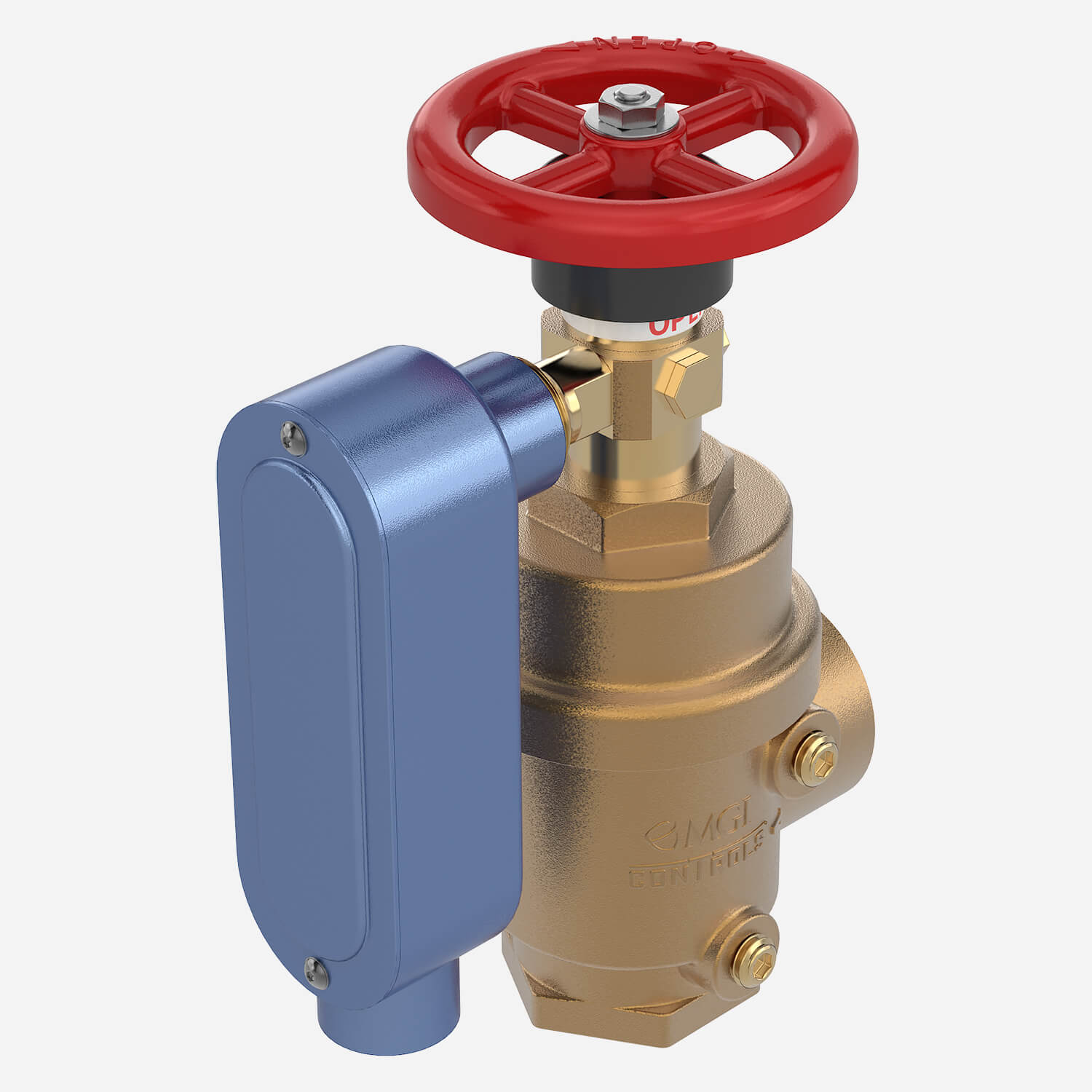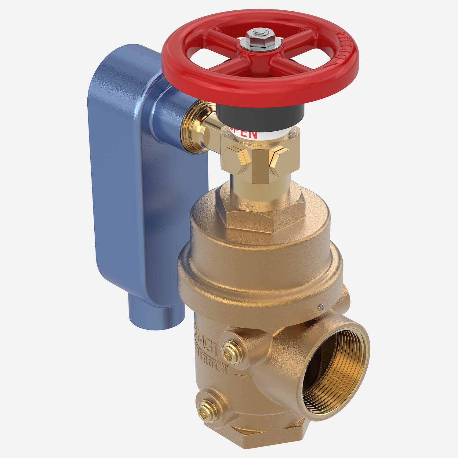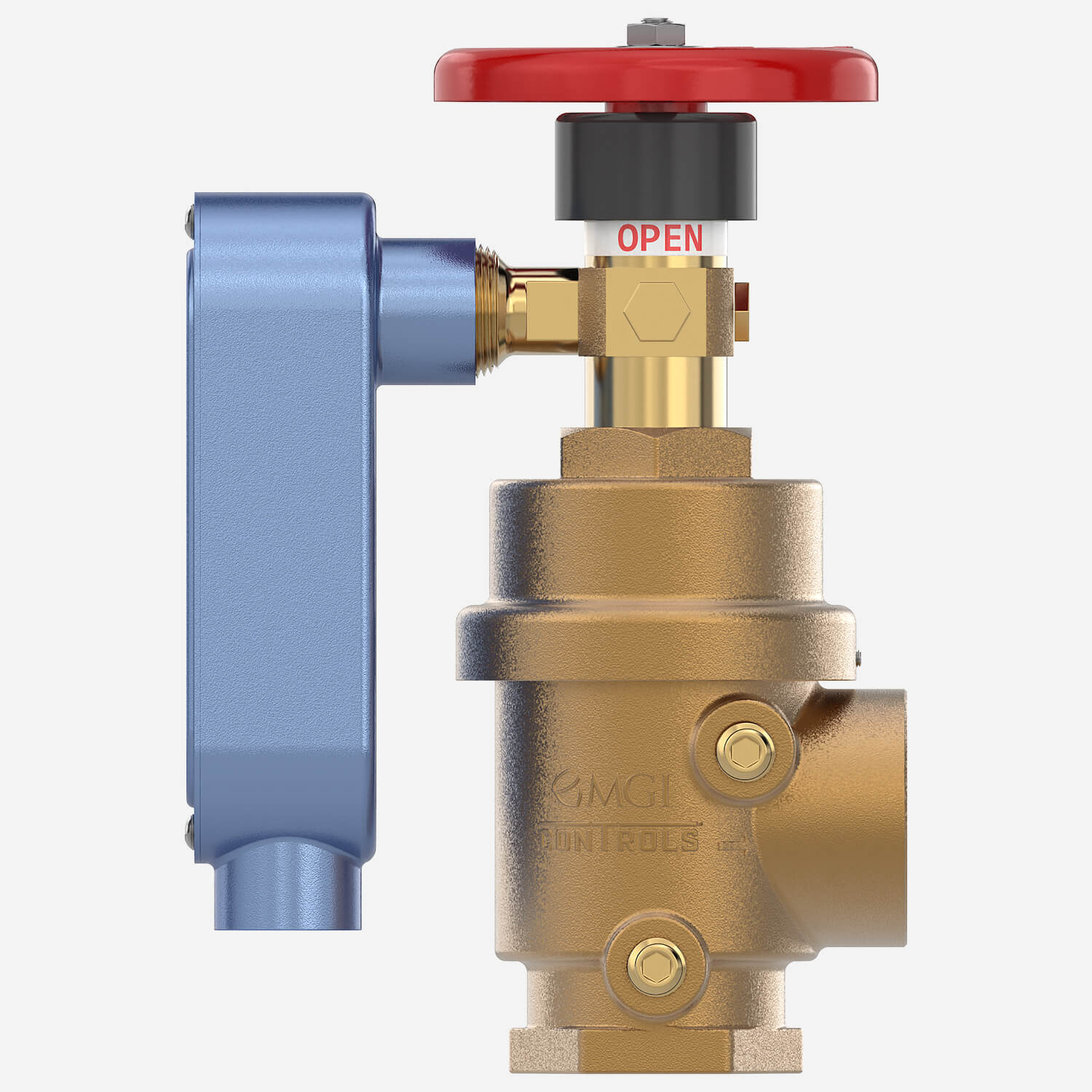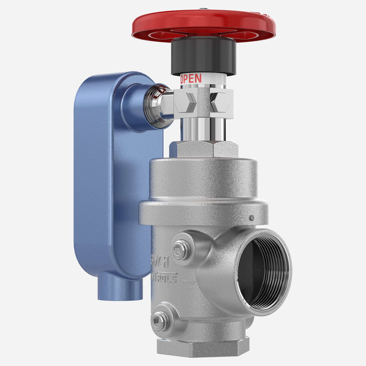 MODEL 4043-FS2 Cast bronze valve with rising stem, internal parts of brass, and chrome silicon. Red aluminum handwheel. Regulates pressure under both flow and no-flow conditions. Female 1-1/2" N.P.T. inlet and outlet.