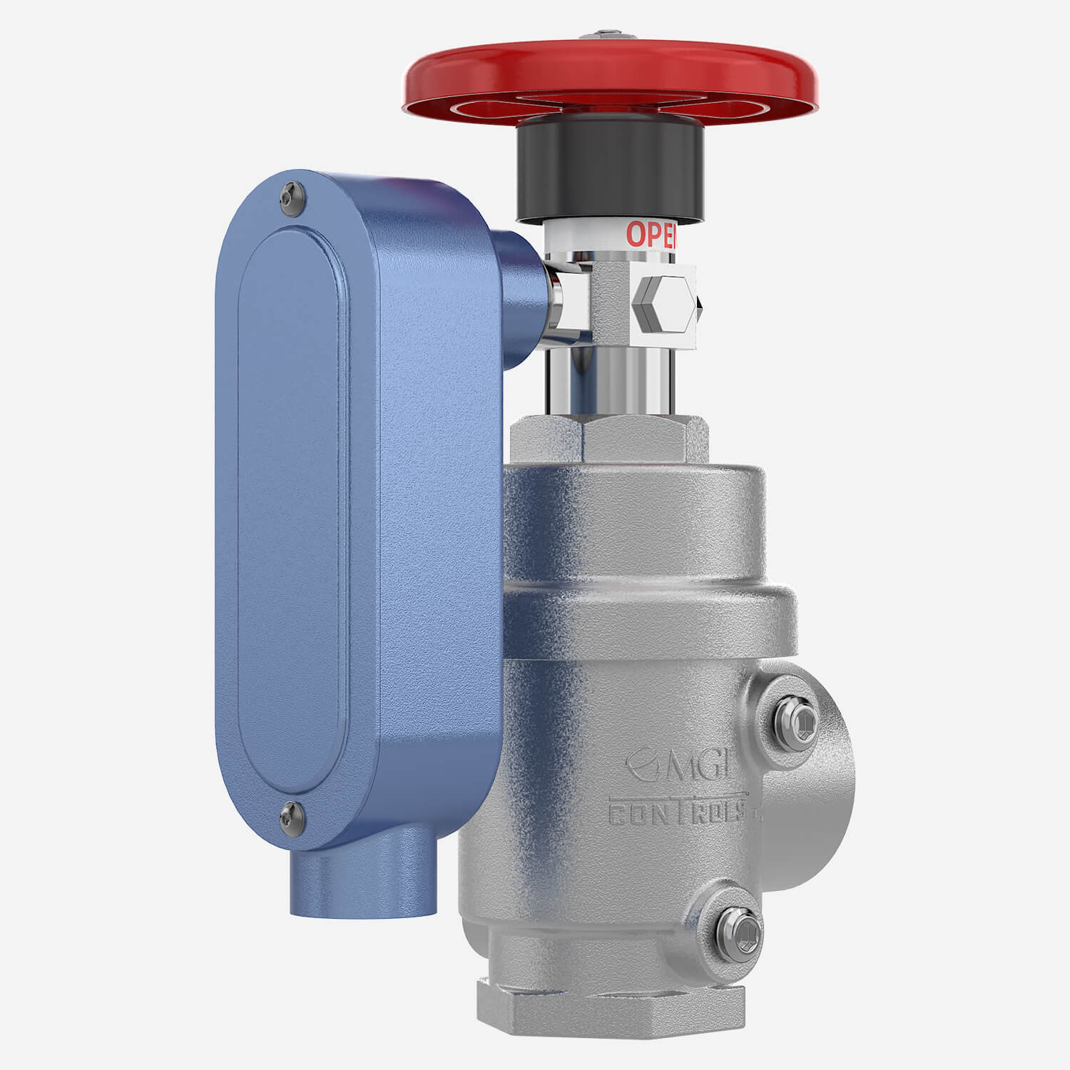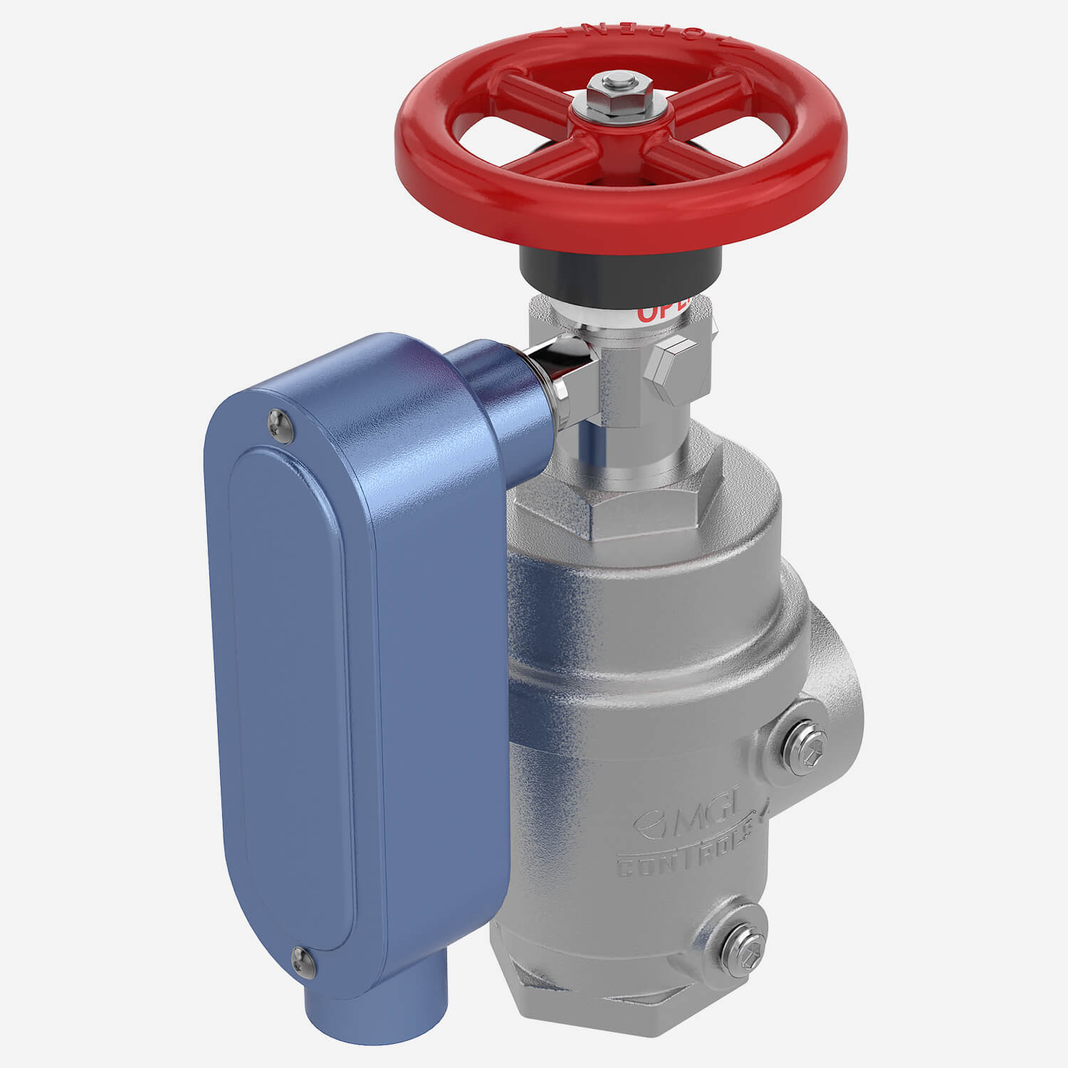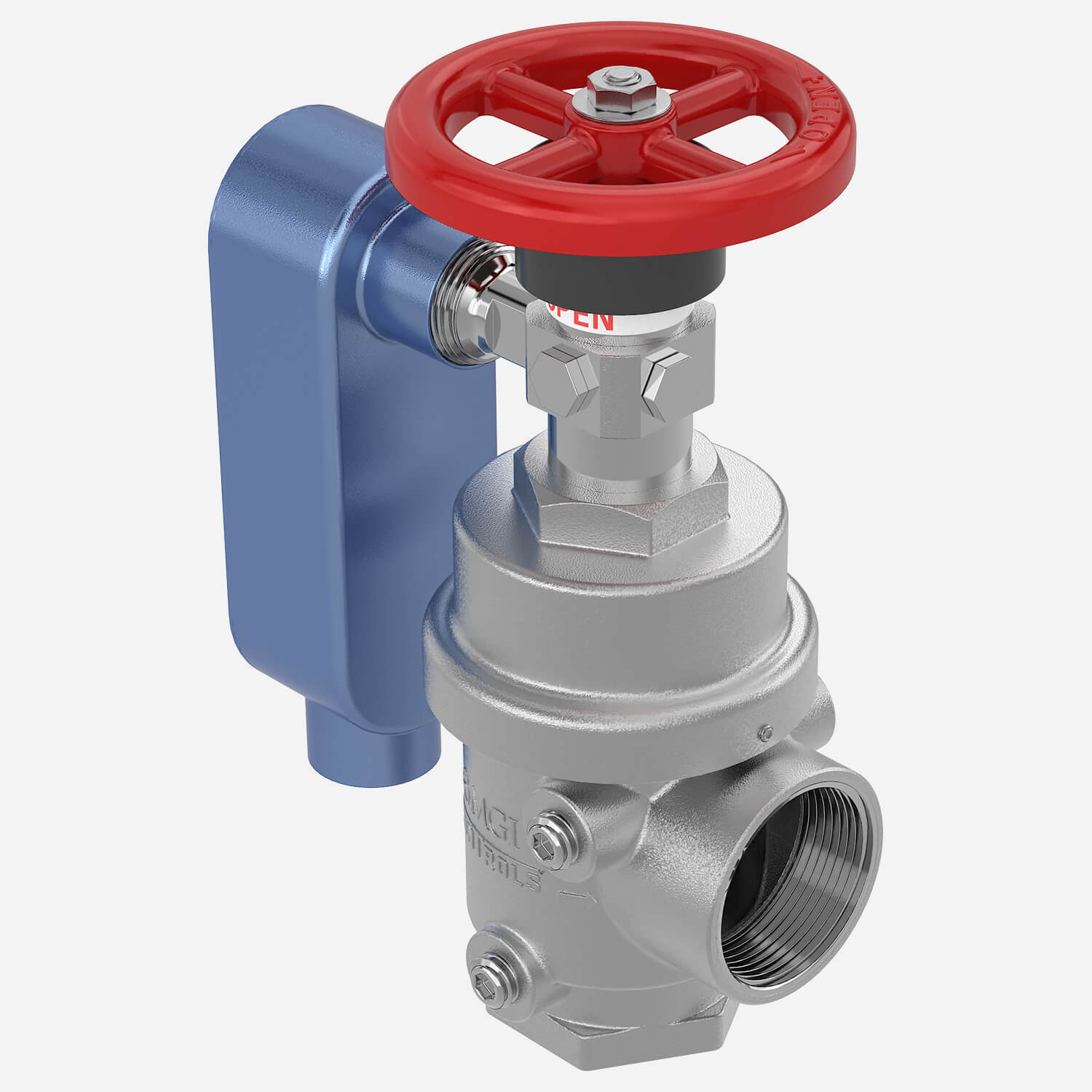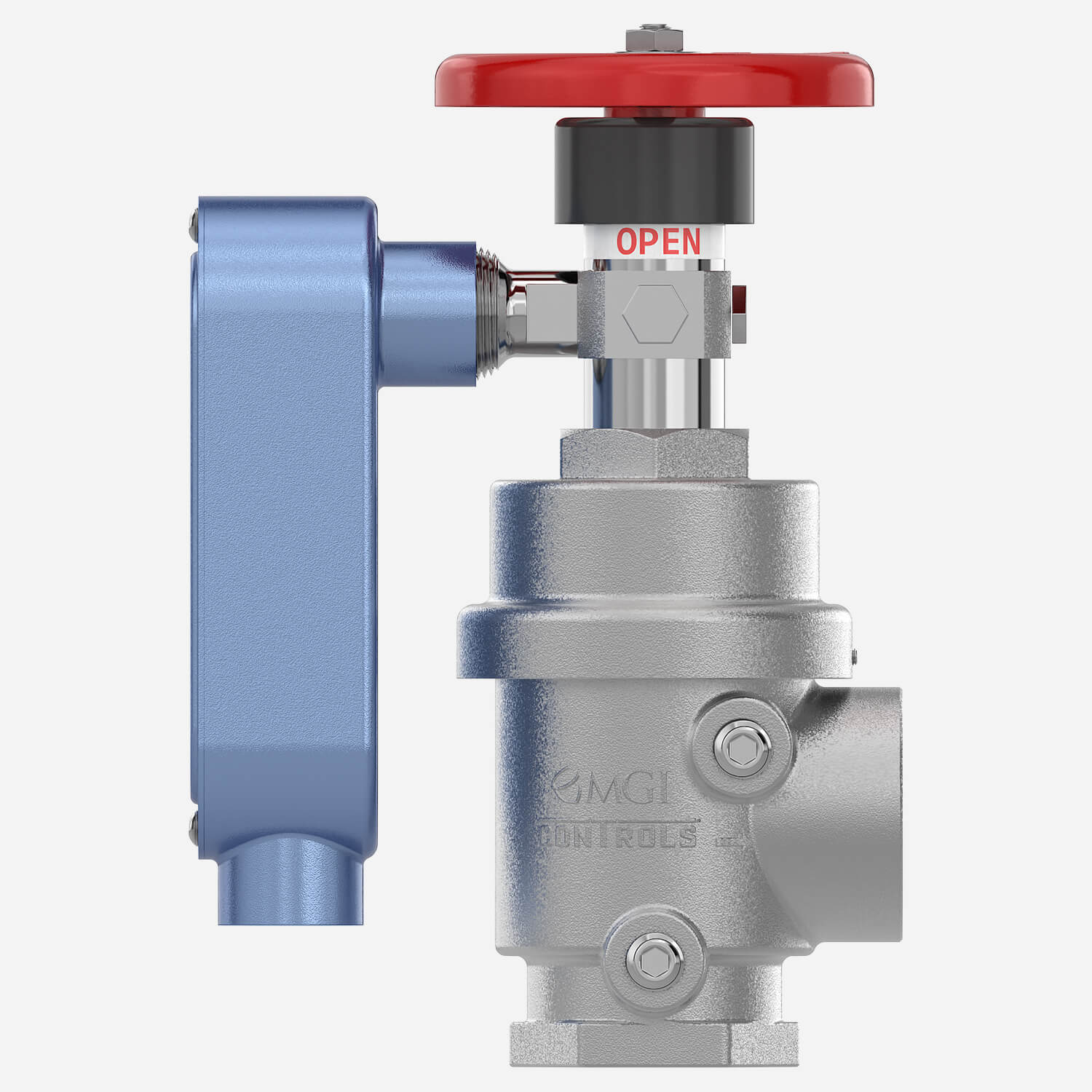 MODEL 4043-FS2 Cast bronze valve with rising stem, internal parts of brass, and chrome silicon. Red aluminum handwheel. Regulates pressure under both flow and no-flow conditions. Female 1-1/2" N.P.T. inlet and outlet.