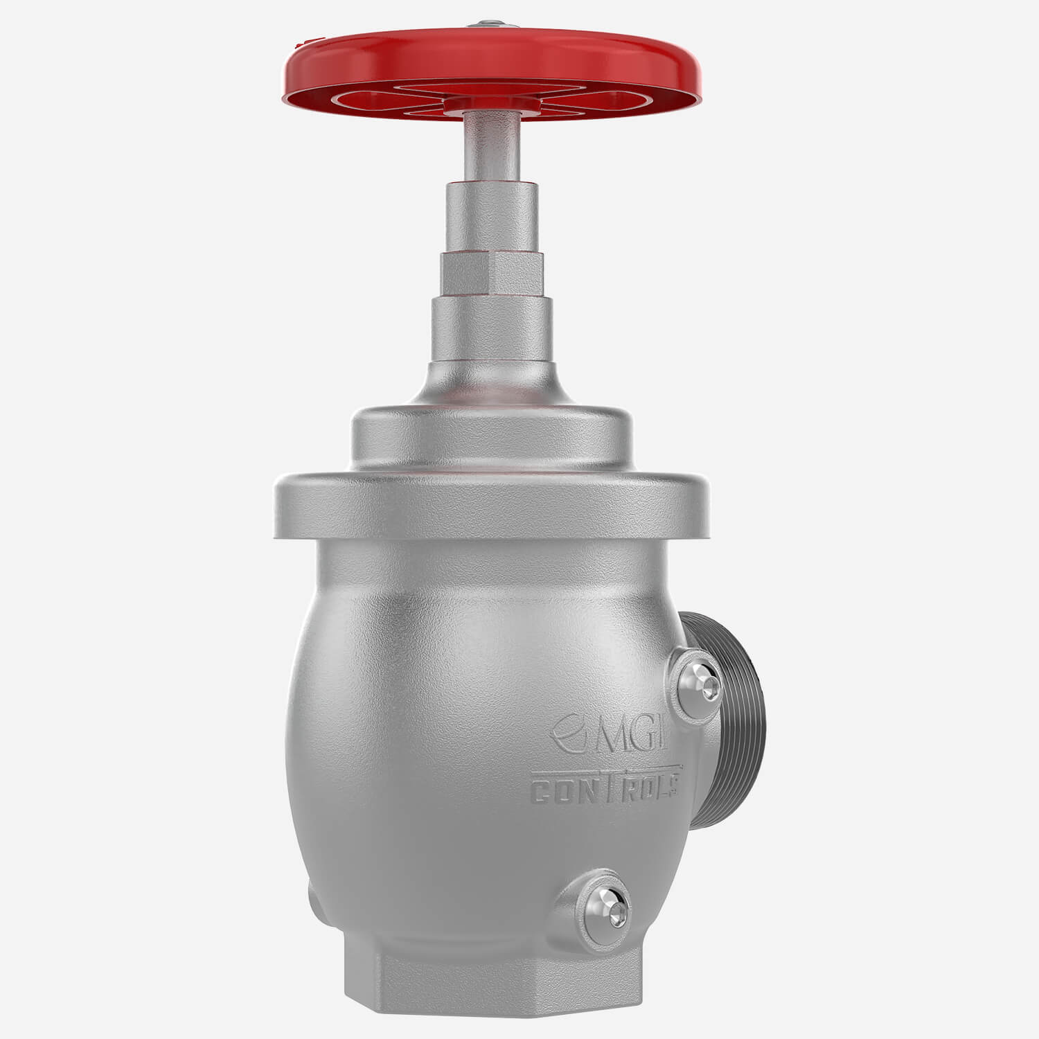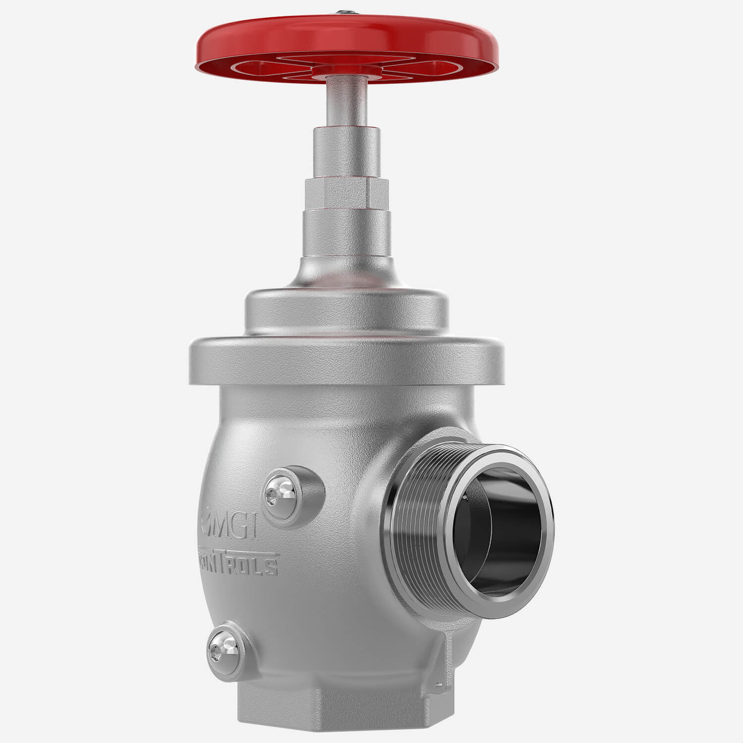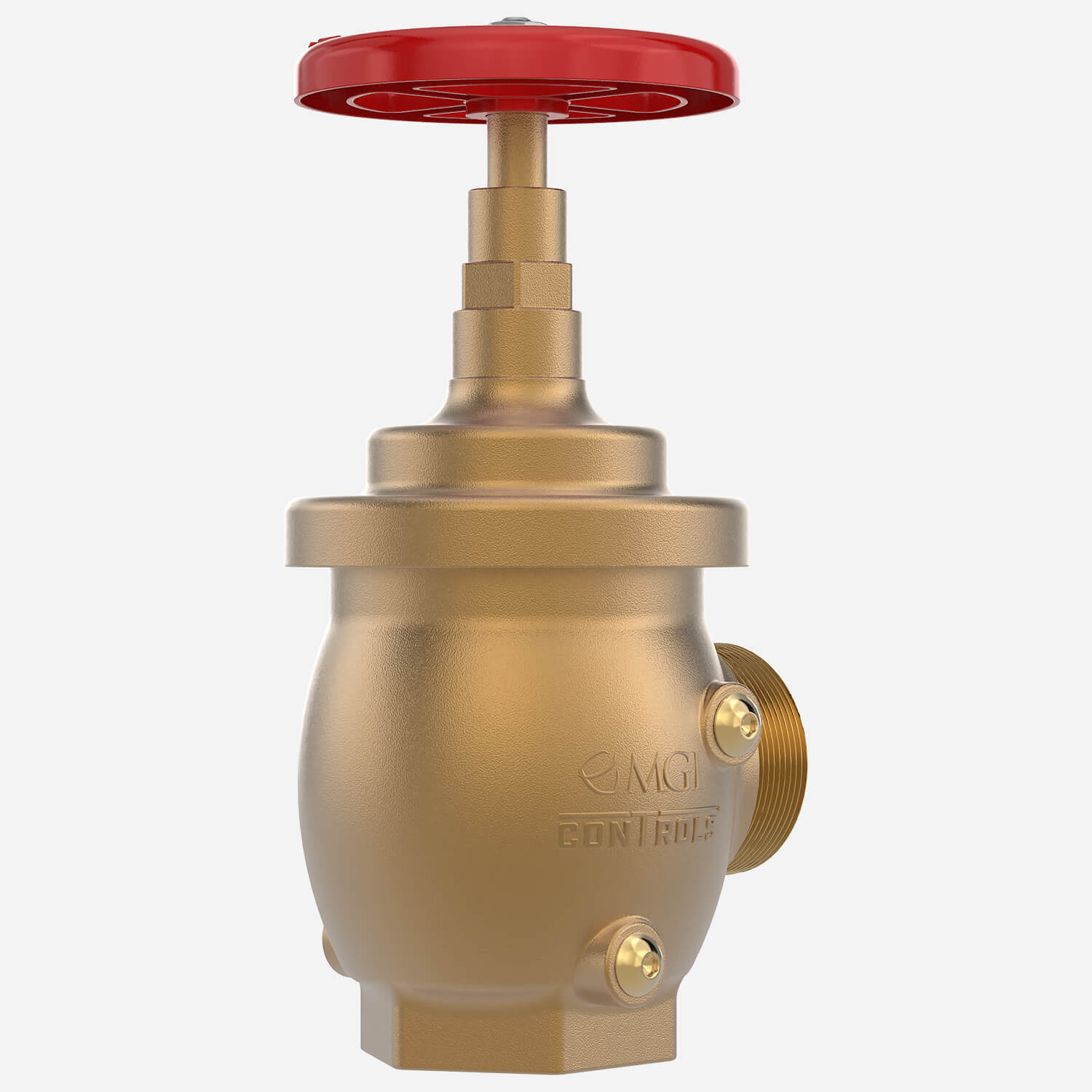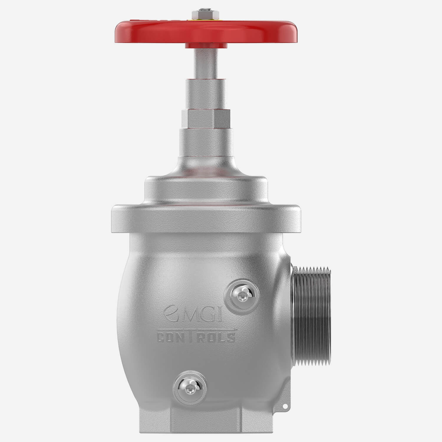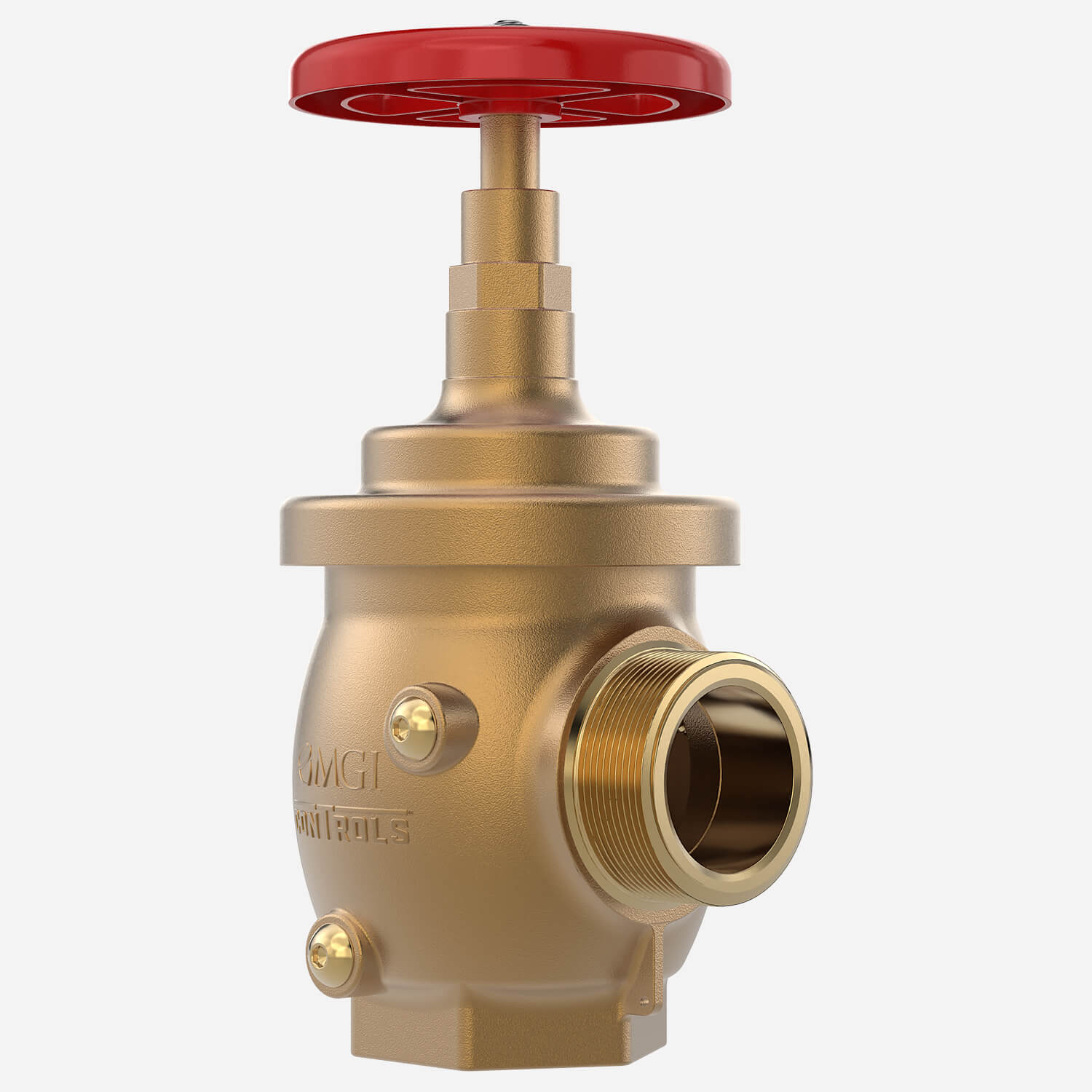 MODEL 4053-FS2 Cast bronze valve with rising stem, internal parts of brass, and chrome silicon. Red aluminum handwheel. Regulates pressure under both flow and no-flow conditions. Female 2-1/2" N.P.T. inlet and male hose thread outlet