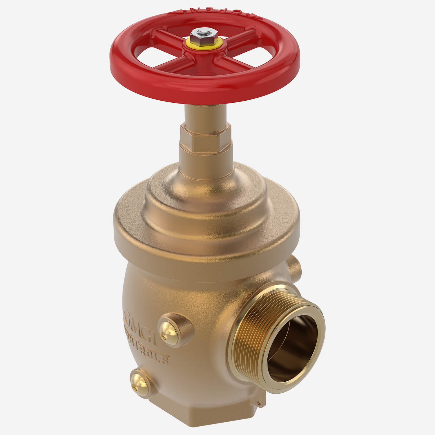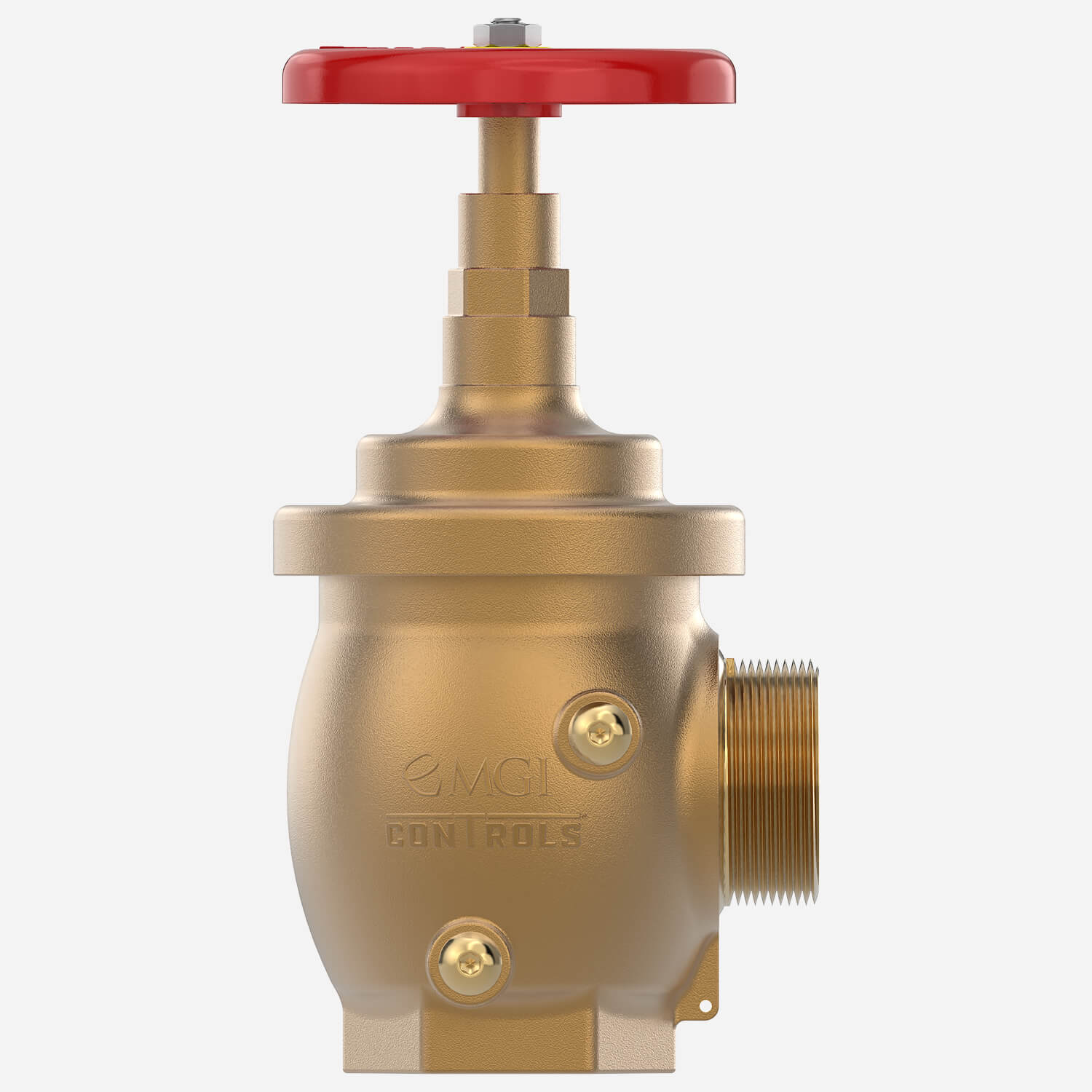 MODEL 4053-FS2-SF Cast brass valve with rising stem, internal parts of brass and stainless steel. Red aluminum handwheel. 2-1/2" Female NPT inlet and 3" male San Francisco thread outlet. Four drilled and tapped ports. Can be used on Class I and Class III standpipes in accordance with NFPA 14.