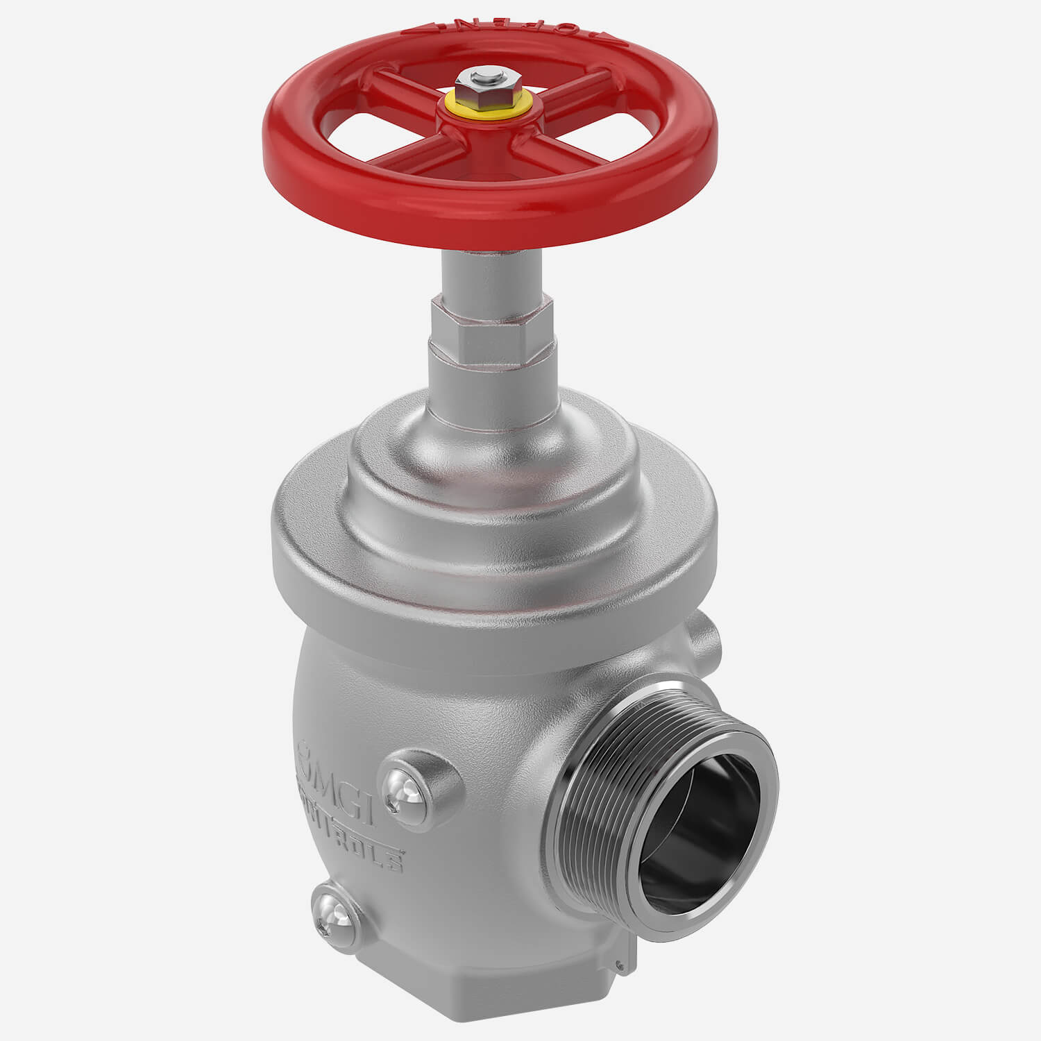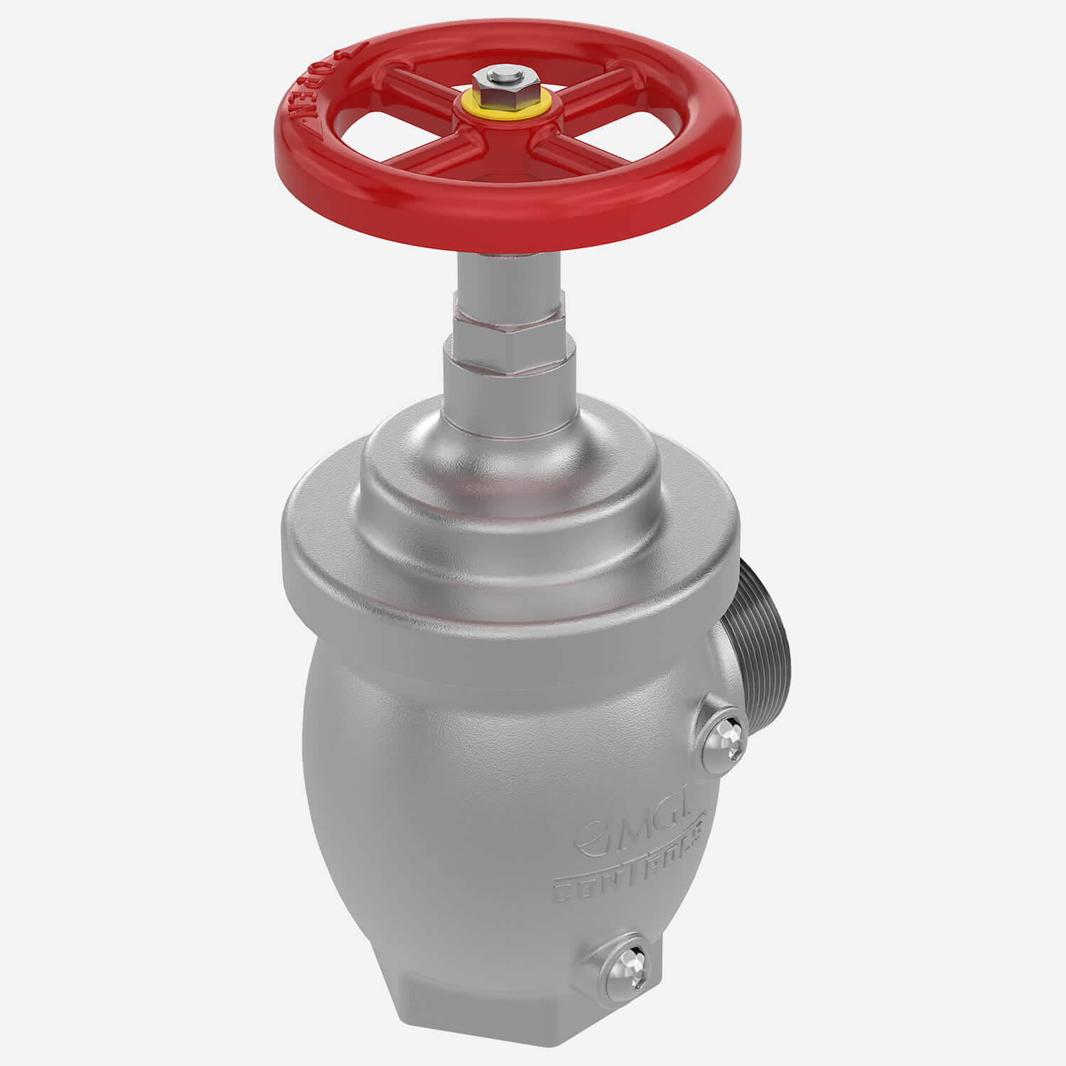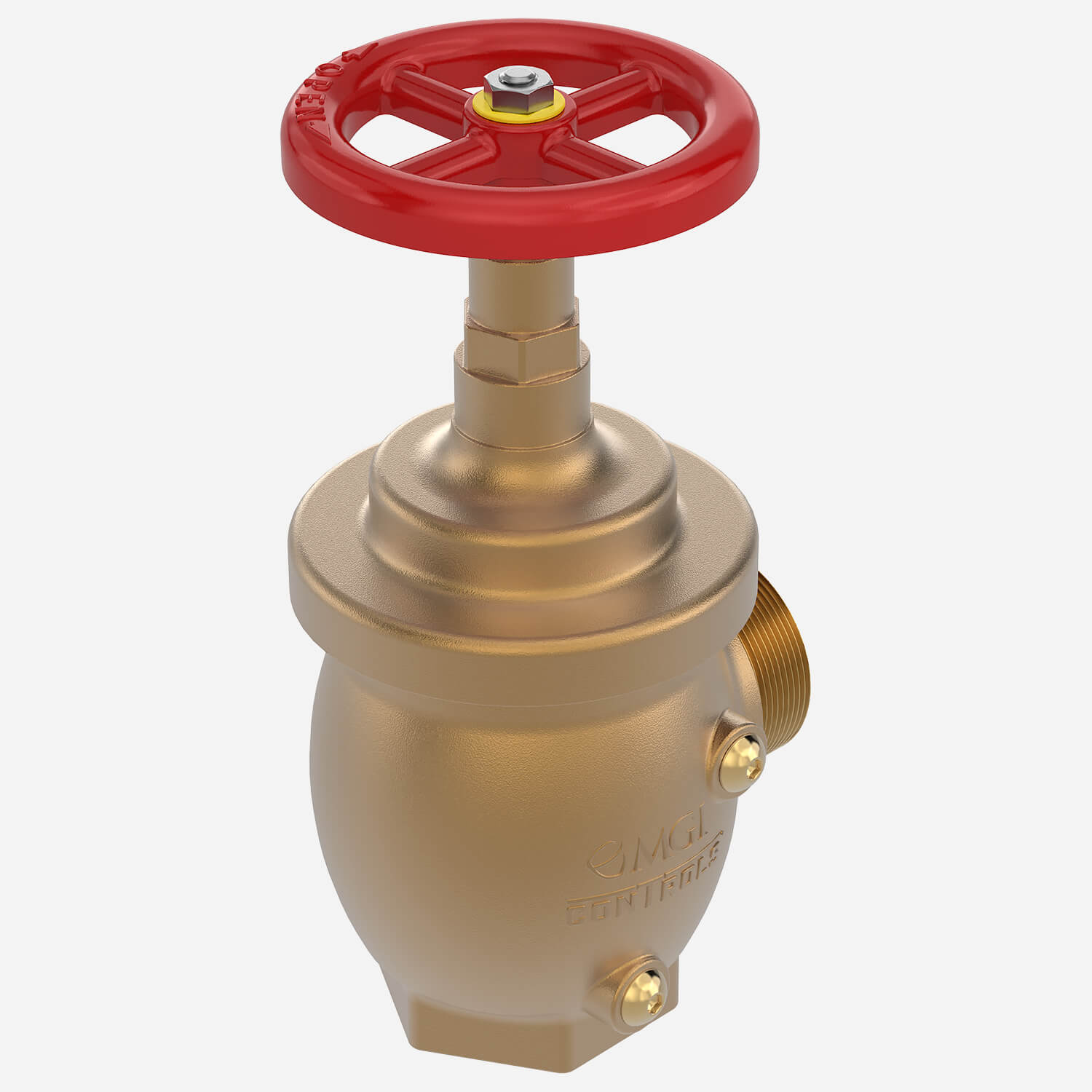 MODEL 4053-FS2-GV-SF Cast brass valve with rising stem, internal parts of brass and stainless steel. Red aluminum handwheel. 2-1/2" grooved inlet and 3" male San Francisco thread outlet. Four drilled and tapped ports. Can be used on Class I and Class III standpipes in accordance with NFPA 14.