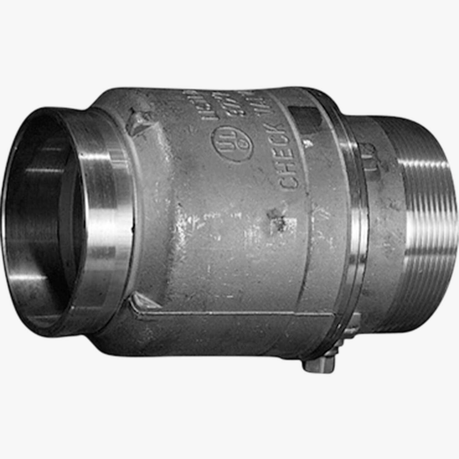 This check valve can be used to permit flow only in designated direction and prevent backflow. It features a forged body with spring loaded brass check a 4” grooved inlet tapped 1/2” NPT for ball drip and 4” male outlet.