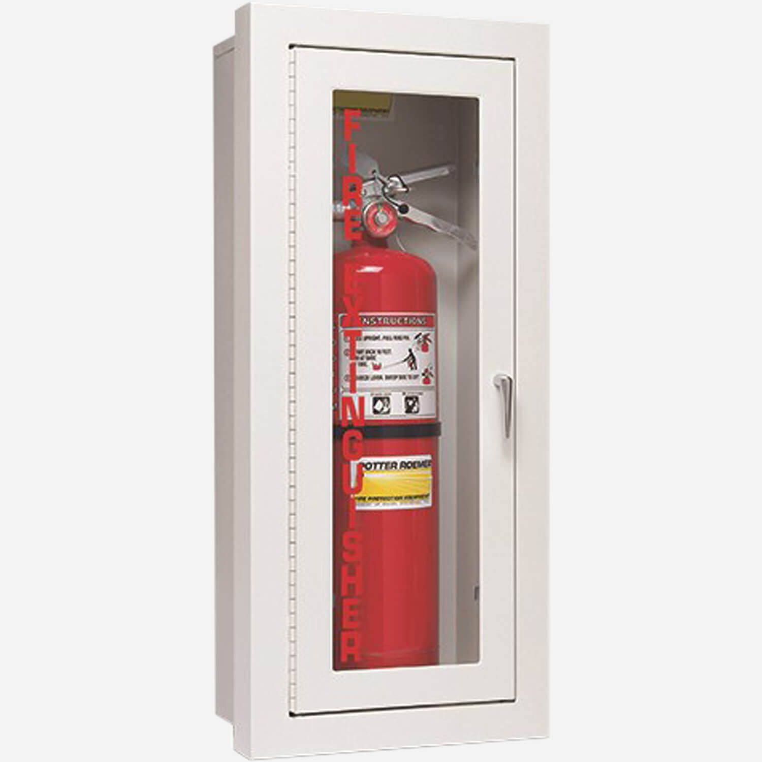 1700 Series cabinets accommodate a single portable fire extinguisher. The cabinet box is 22 gauge steel. The door and frame are 20 gauge steel. The door has a continuous steel hinge (brass pin). The steel corner seams are welded and ground smooth. Recessed semi-recessed and surface-mounted cabinets are furnished with square edges. All components are powder-coated with an electrostatically-applied thermally-fused recoatable white polyester finish.